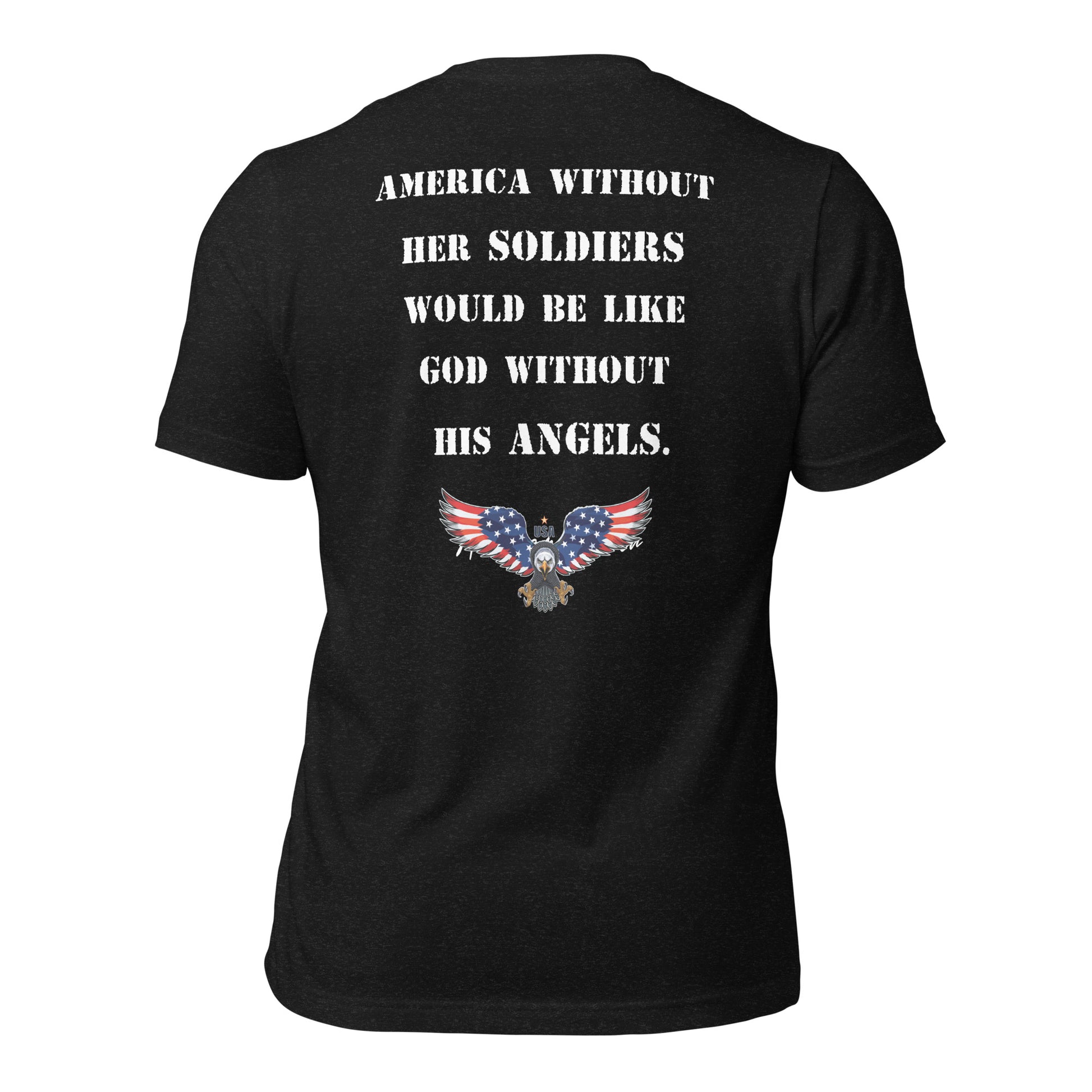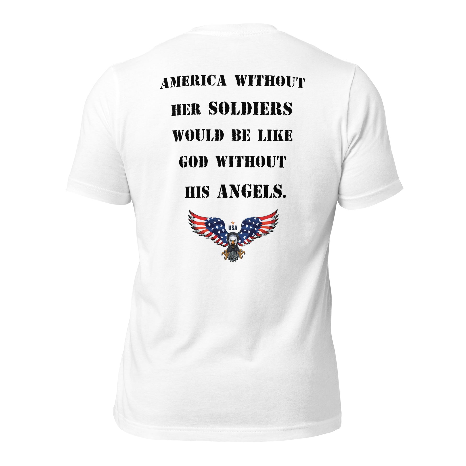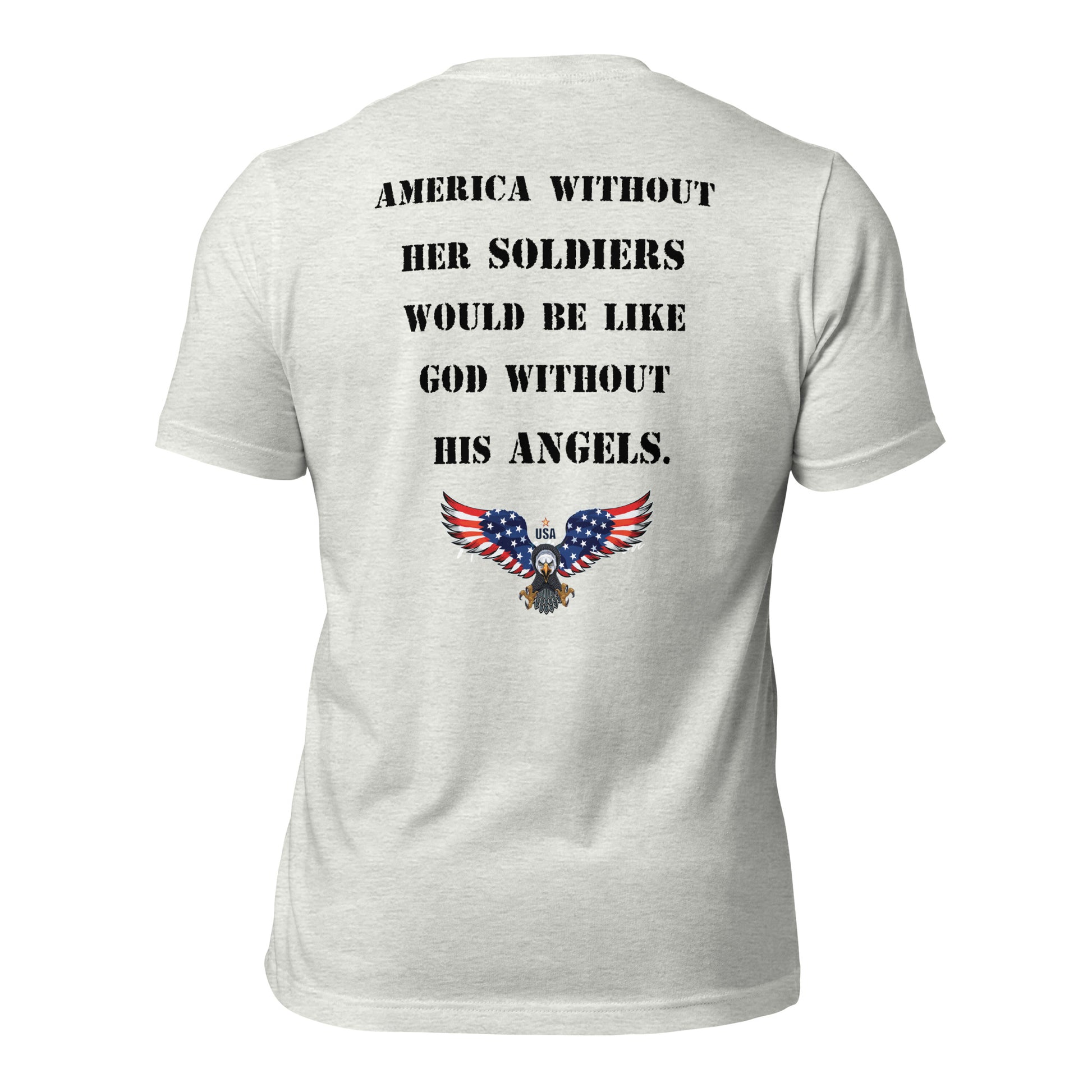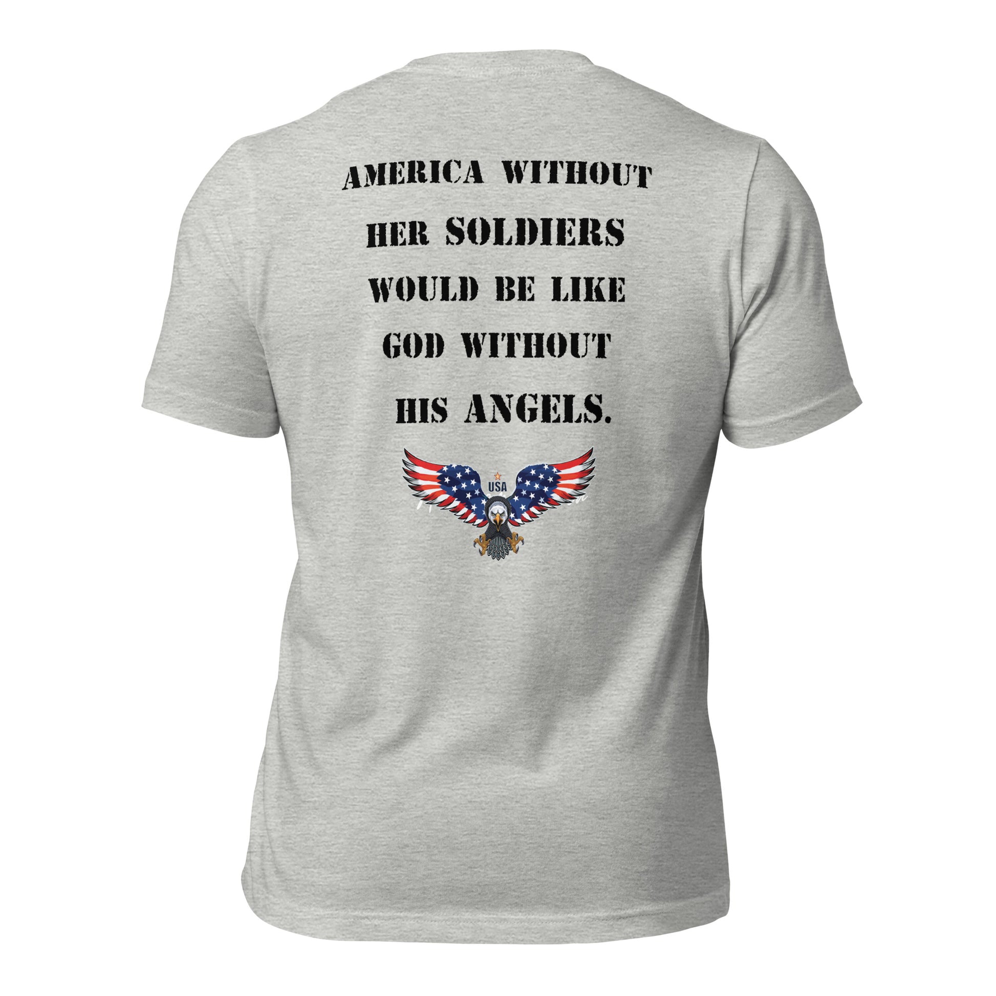 Wear your patriotism like a badge of honor with our America Without Her Soldiers is Like God Without His Angels patriotic T-shirt! Ultra-soft and lightweight, this USA American pride shirt combines comfort and strength, and is designed to show unwavering support for US veterans.